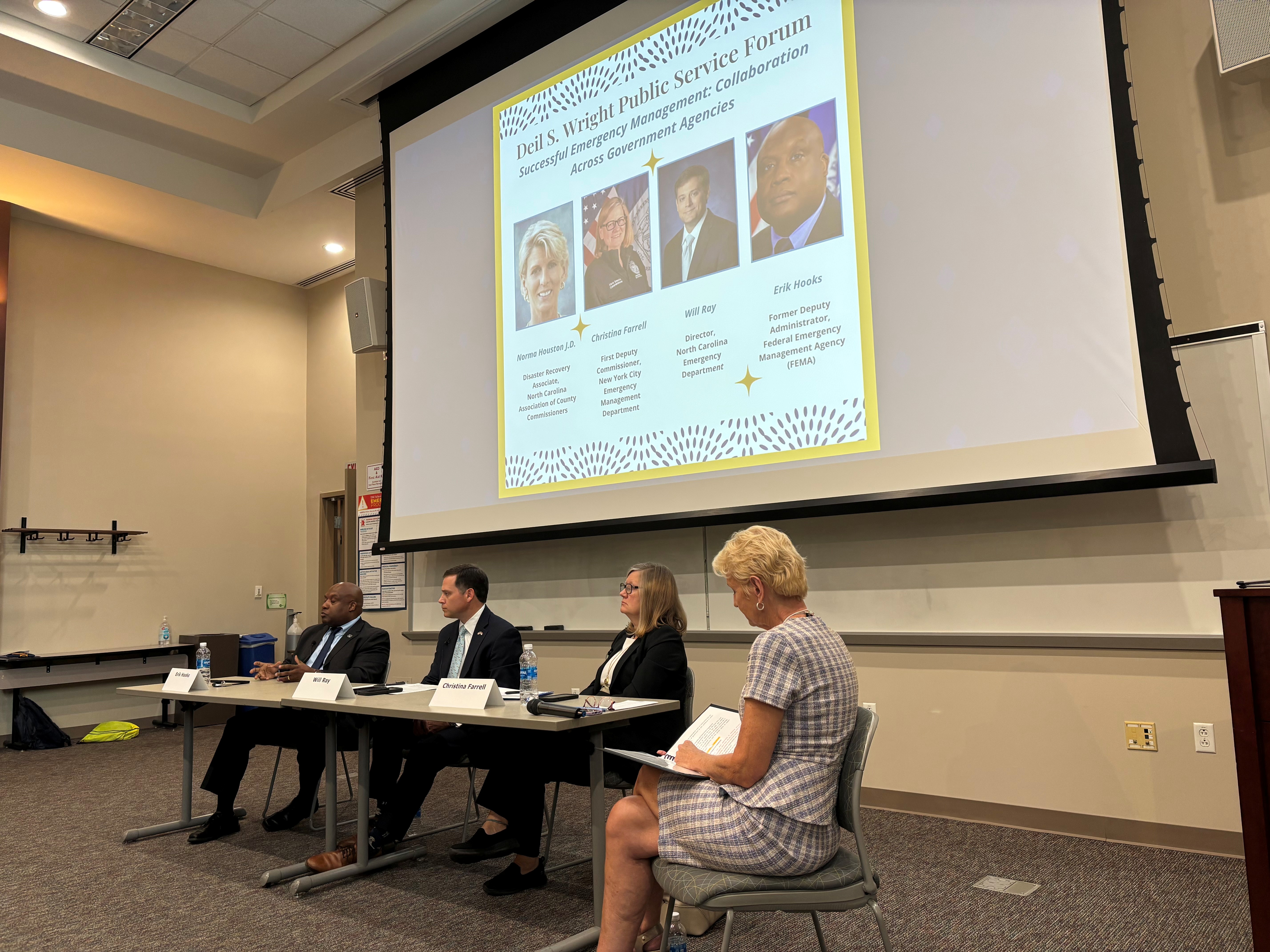 Students, faculty, staff, alumni, and supporters of the UNC Master of Public Administration program gathered Friday, October 10, 2025, to participate in the annual Deil S. Wright Public Service Forum. This year’s topic was “Successful Emergency Management: Collaboration Across Government Agencies.” The event was moderated by Norma Houston, former School of Government faculty member and chief of staff to UNC President Peter Hans.