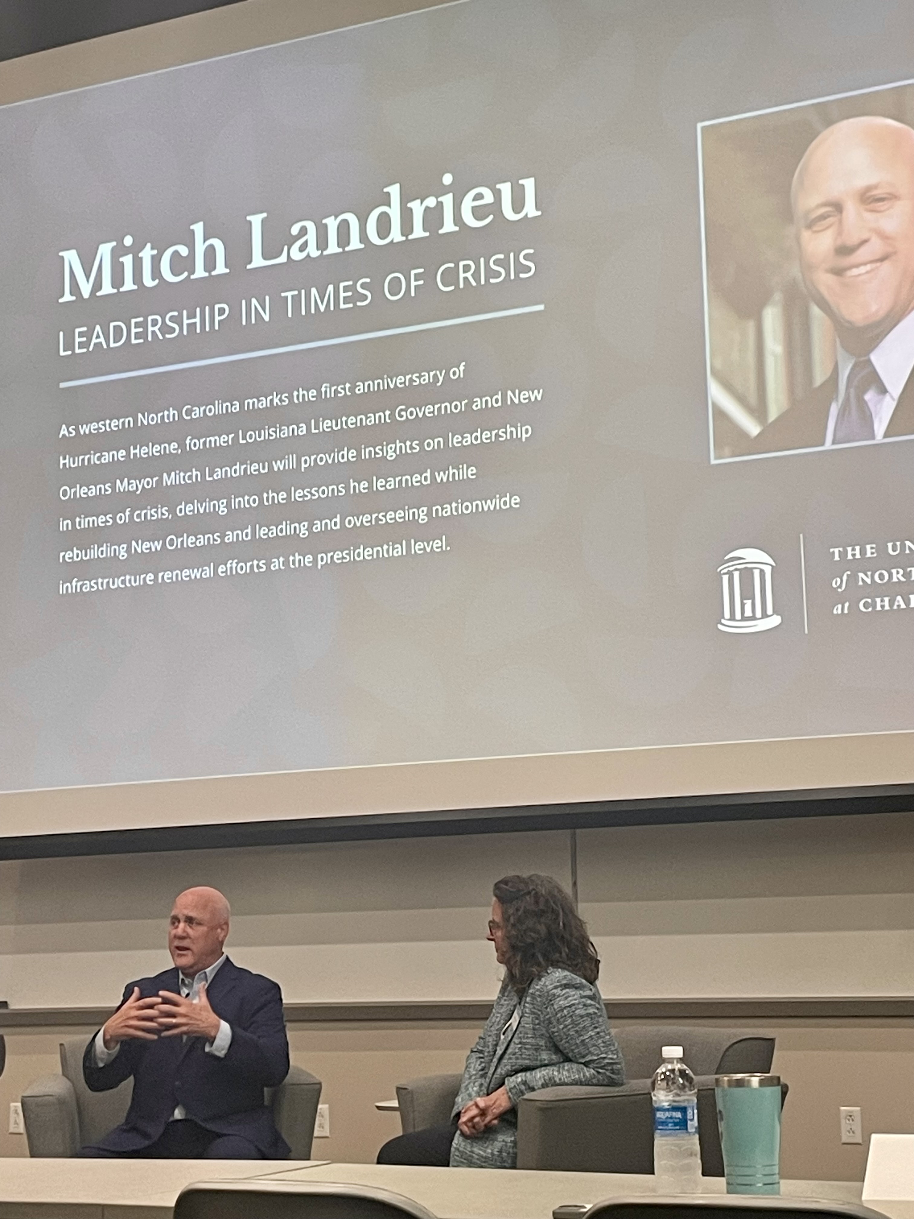 Landrieu told the audience about visiting the affected regions of North Carolina following Helene’s destruction in early October 2024. He spoke of how government has a duty to lead the recovery efforts, but he also emphasized how grassroots efforts to respond to disasters must and will always come organically from the community members served by the government.