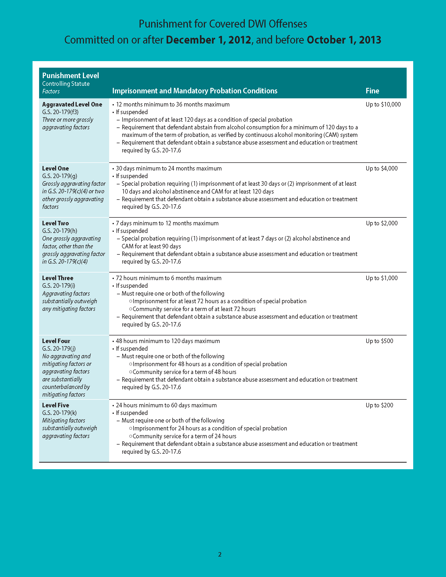 For offenses committed on or after October 1, 2013, see the 2025 edition of the North Carolina Sentencing Handbook. For offenses committed before October 1, 2013, the charts below establish the sentence selection, imprisonment, mandatory probation conditions, and fines for each level of impaired driving sentenced under G.S. 20-179.