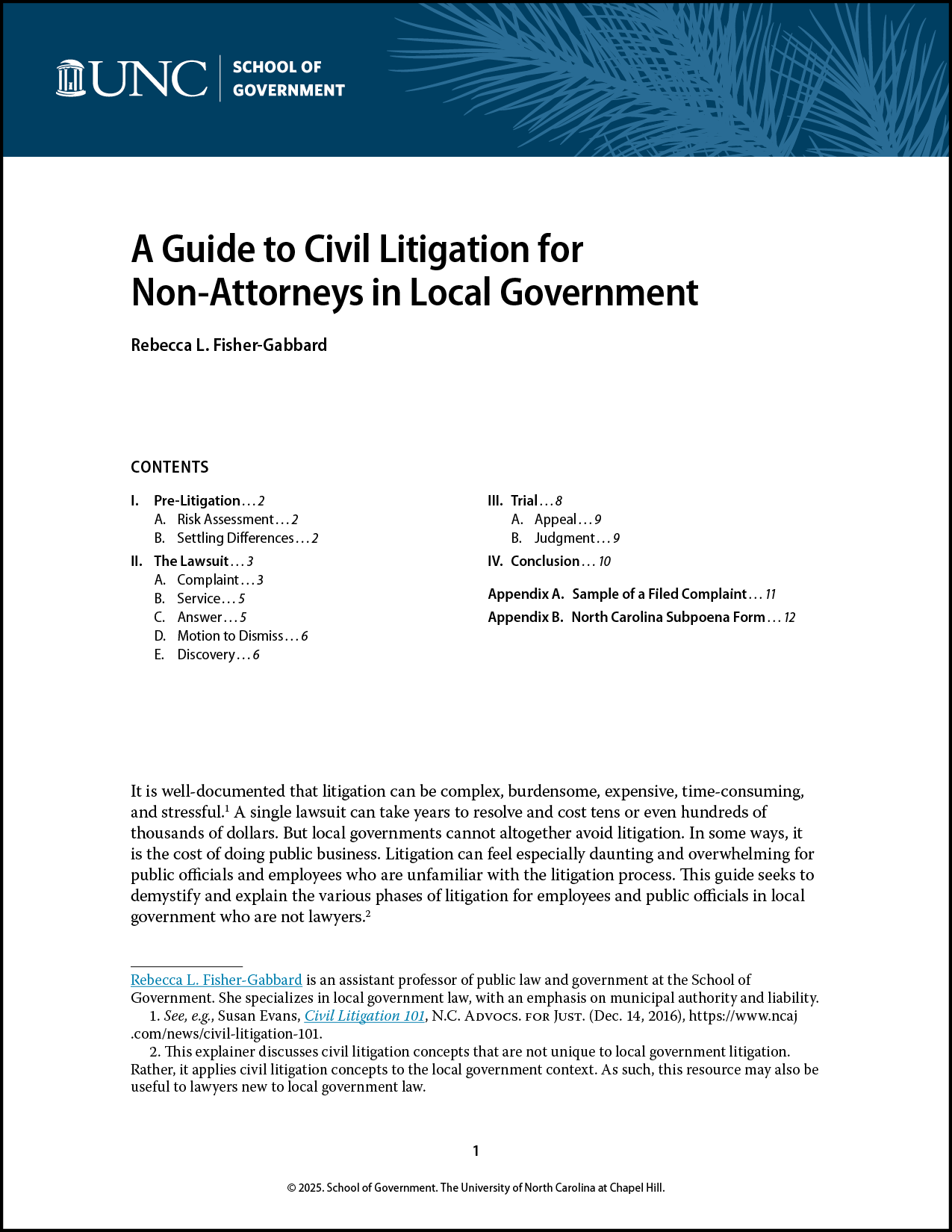 A single lawsuit can take years to resolve and cost hundreds of thousands of dollars, but local governments cannot avoid them altogether. A Guide to Civil Litigation for Non-Attorneys in Local Government provides a brief, accessible overview that demystifies and explains the various phases of this daunting process for employees and public officials in local government who are not lawyers.