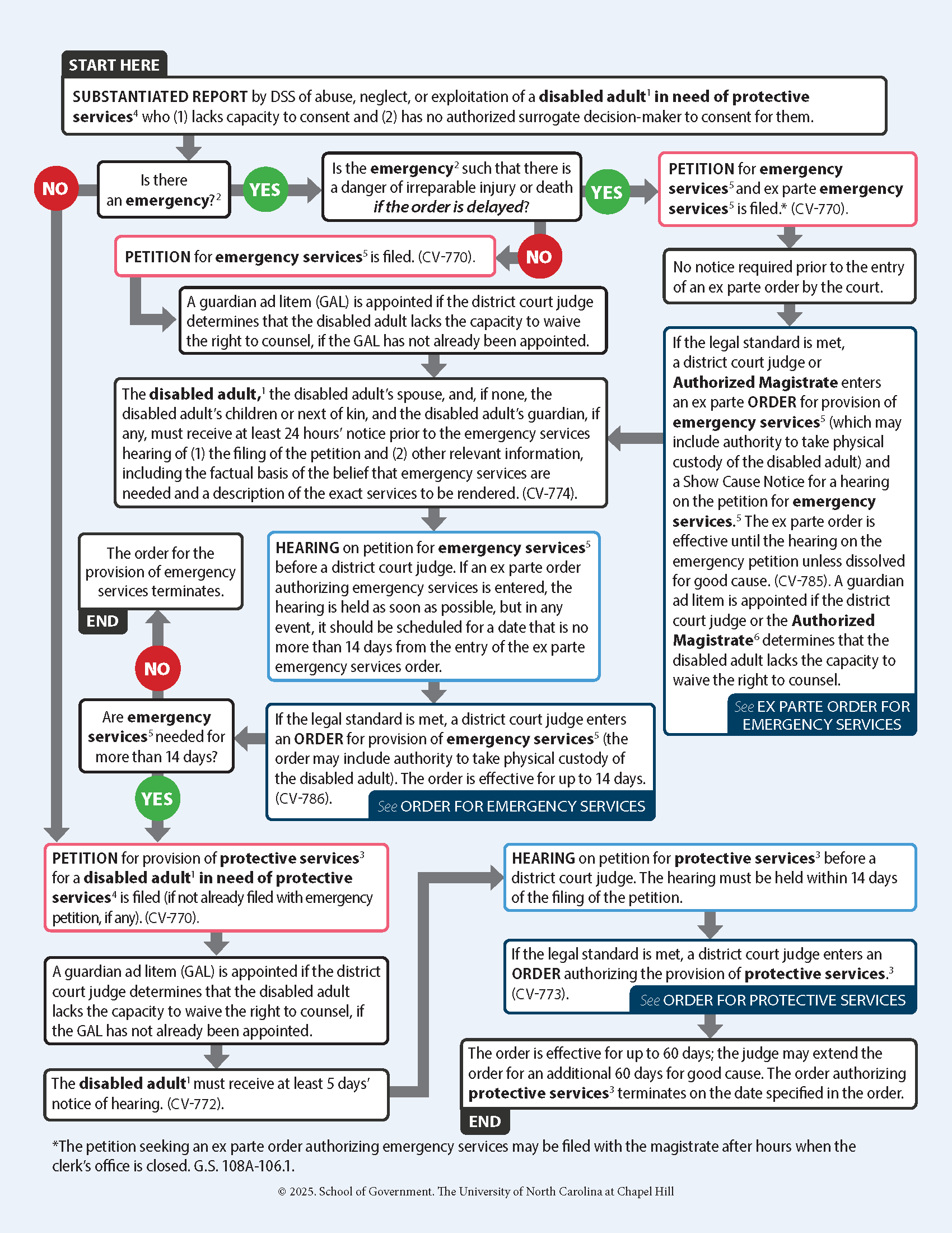 This resource is intended to help county DSS directors, social workers, attorneys, court officials, and others working in the area of adult protective services in understanding the procedures applicable to adult protective services court proceedings, including proceedings to obtain an order for protective services, an order for emergency services, and an ex parte order for emergency services. The text and flow chart in this resource have been updated to reflect legislative changes from S.L. 2025-27 and replace the previous version of this publication, which was published earlier this year.Â