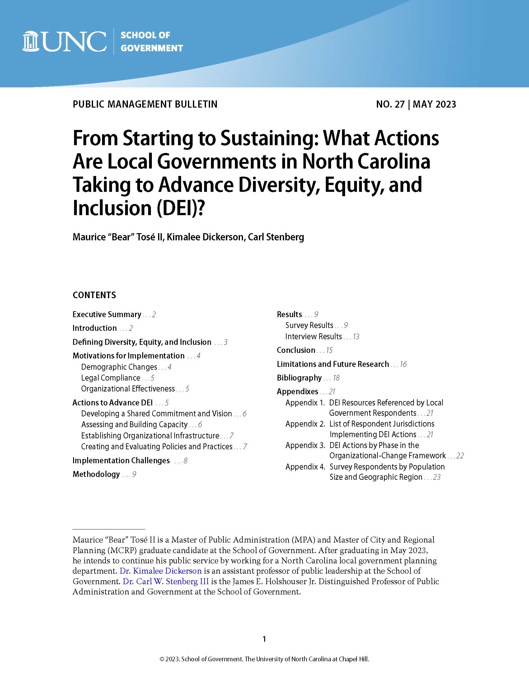 Many local governments are recognizing the importance of building more diverse, equitable, and inclusive workplaces and communities. Municipal and county administrators and elected officials are increasingly interested in learning about the steps they can take and the steps other local governments are taking. In response, the coauthors conducted a study to understand how North Carolina local governments were embedding diversity, equity, and inclusion (DEI) principles and practices in their organizations.
