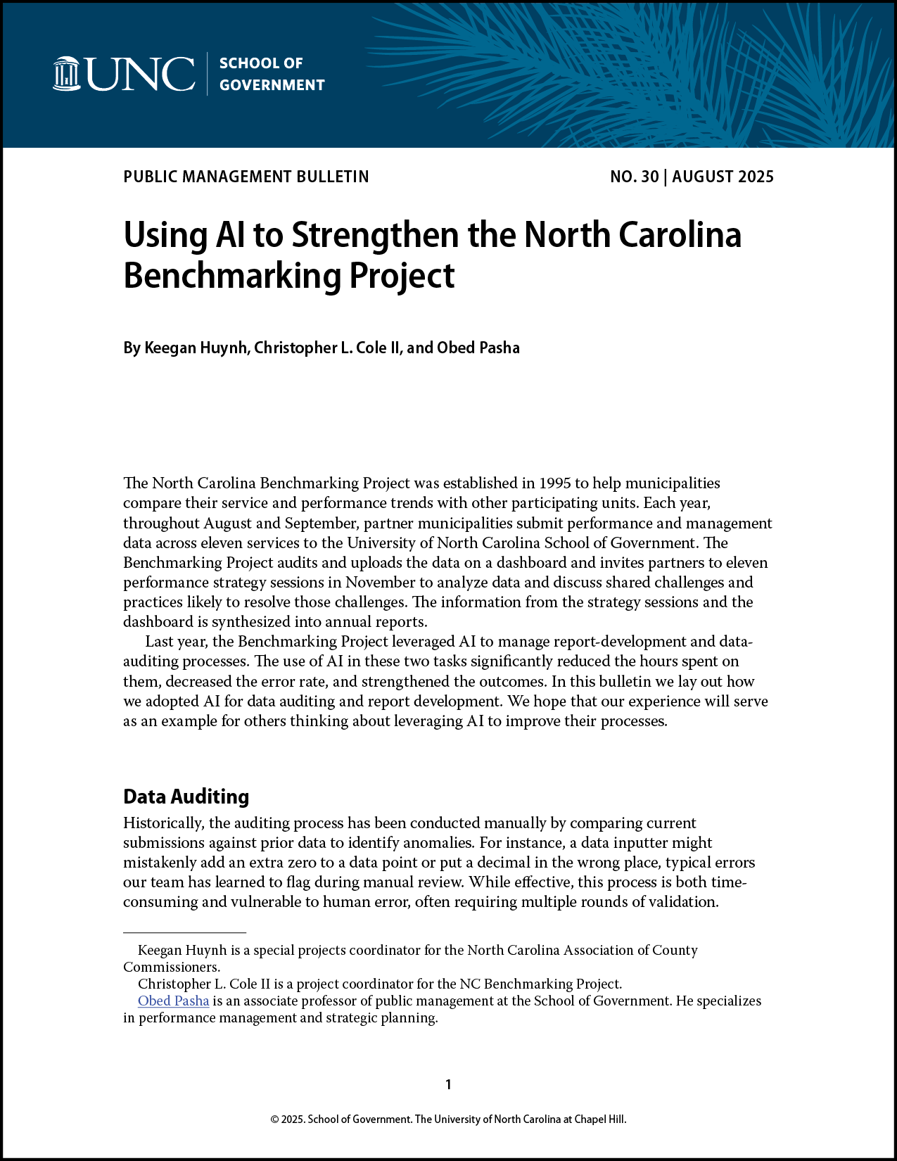 Keegan Huynh, a special projects coordinator for the North Carolina Association of County Commissioners, and Christopher L. Cole II, a project coordinator for the North Carolina Benchmarking Project, co-authored this bulletin.